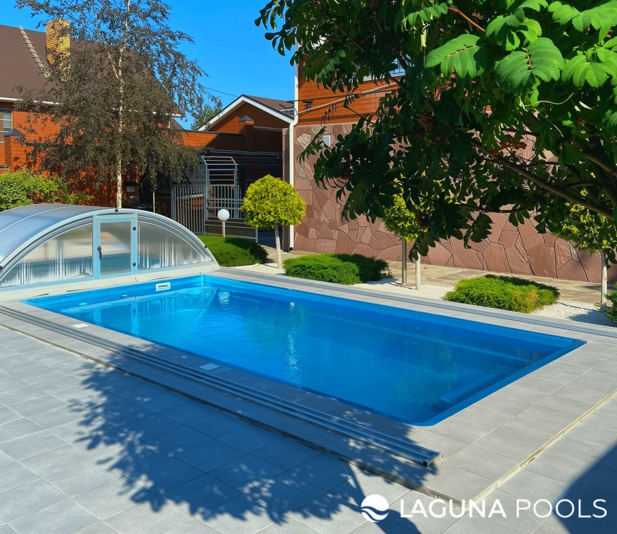 Прямоугольный бассейн с сдвижным поликарбонатным павильоном и белым гравием вокруг